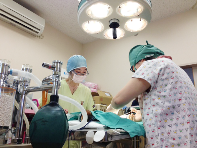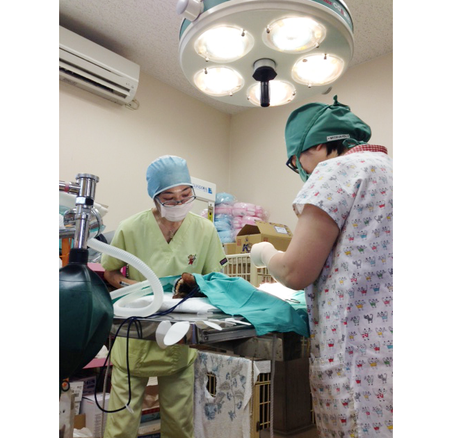 福島に2年半以上通い続けた獣医師 遠藤文枝さんは、日本でなかなか定着しない早期不妊去勢手術を女性開業医にデモンストレーションしている。