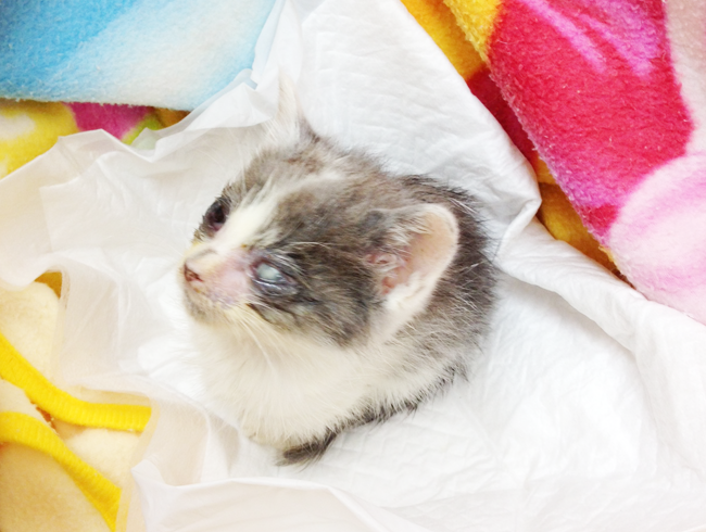 前回のTNRの際に保護したチビオ。救助時は衰弱して動く事もできなかった。