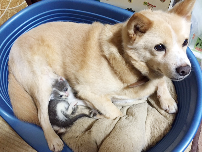現在はボランティアさんのお宅で葛尾村から保護されたチロと一緒に過ごし、順調に回復。写真ではチビオをチロが優しく抱きかかえて一緒に寝ています。