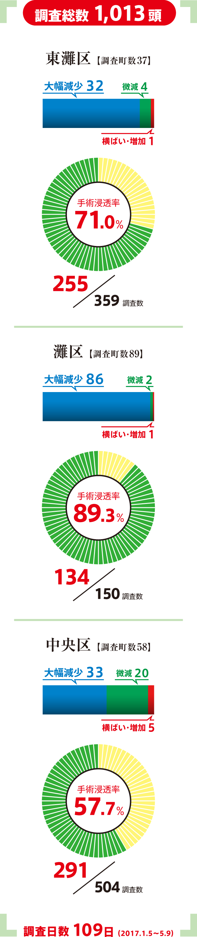 この調査結果は5月11日に神戸市動物管理センターに提出され、同市のノラ猫の繁殖対策に活用するよう求めました。また、過去5年間の神戸市全域の町・通別の仔猫の引き取りデータを集計し、各区のトップ3(灘区を除く)の引き取り依頼リピーター住民のいる地区には必ず対策を打つよう求めました。