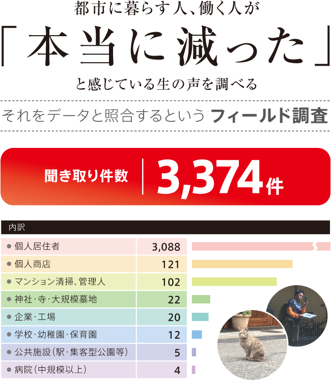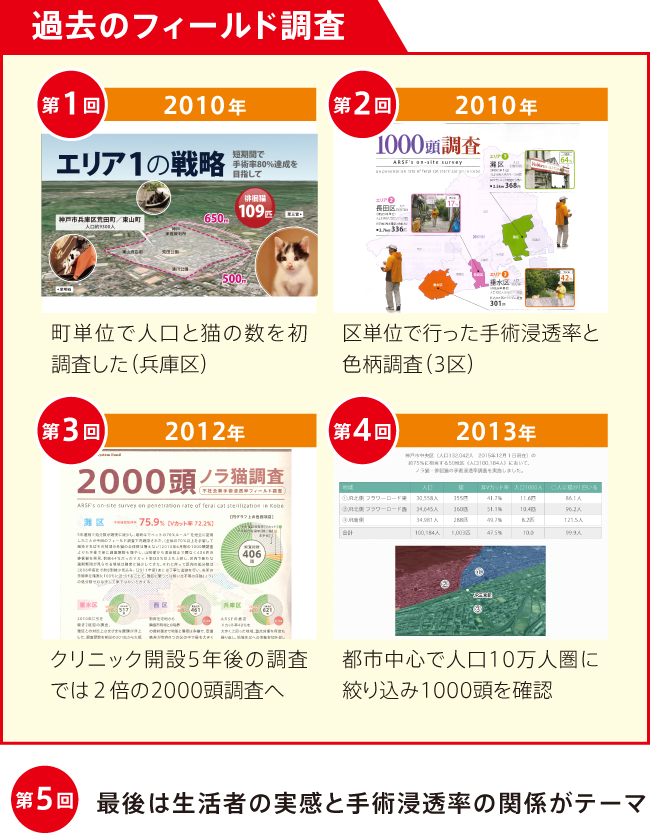 飼い主不明猫および放浪猫による繁殖状況をフィールド調査し、地域住民の「生活者」としての肌感覚による猫の総数減少の実情を知る。また、この調査事業の実施により、猫の過剰繁殖と行政施設での収容数推移の相関関係を立証することを目的とし、科学的な繁殖予防法を確立する。